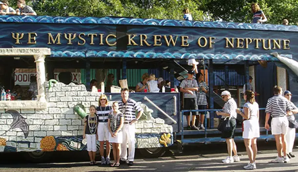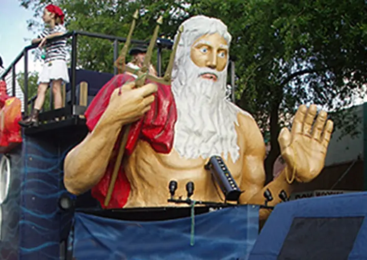 YMKN’s first-ever float was a humble rented vehicle featuring a striking Neptune head as its centerpiece. It carried only the King and Queen, with the rest of the Krewe walking alongside. Despite the simplicity, the thrill of parading before enthusiastic crowds clamoring for beads made those early members feel like rock stars. However, as rental costs increased each year, the Board of Directors decided that owning a float would be more economical.