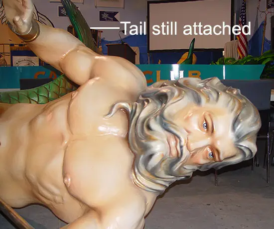 Back at the Cove, the Krewe got to work incorporating the rescued display into our float. King Neptune, magnificent but oversized, had to be cut in half to fit. The upper half, featuring Neptune’s torso and trident, now proudly adorns the front of the float, while his tail was mounted inside, hovering gracefully over the staircase.