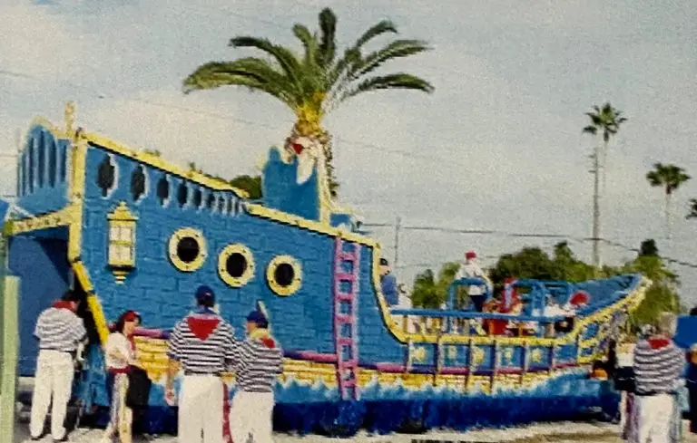 The Krewe’s first self-built float was modest compared to today’s standards. Constructed on a bus frame, it was small, unstable, and towed by a Ford Explorer. This led to an unfortunate incident. On its way to the Ybor Knight Parade via I-275, the float – towed by YMKN XO Gary Parker, with Jerry Babcock and reigning King Bob Mattioli as passengers – faced disaster. A passing semi-truck created a wind draft that caused the float and Explorer to fishtail, eventually flipping and rolling over.
